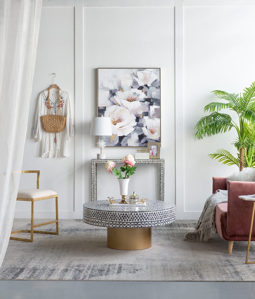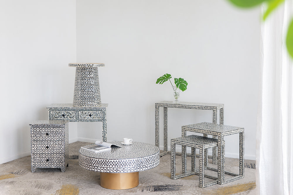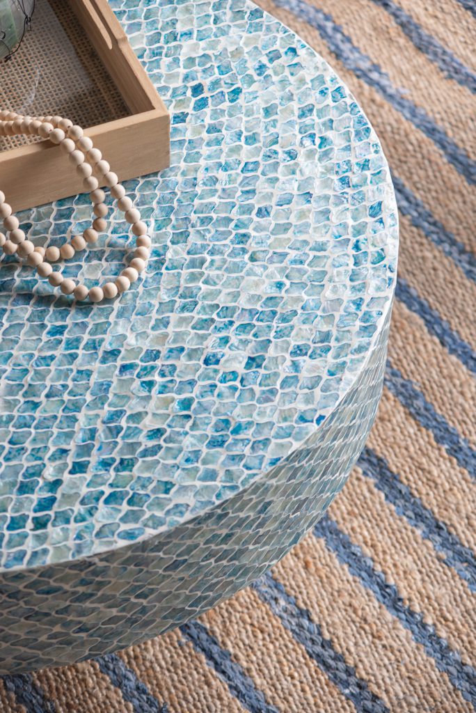 Add drama and functionality to your living room with the Hyperion coffee table. Crafted in blue it features a gorgeous capiz design formed from meticulously inlaid pieces and complemented with a pedestal base. Perfect for a coastal retreat or contemporary bohemian room.