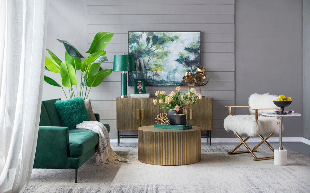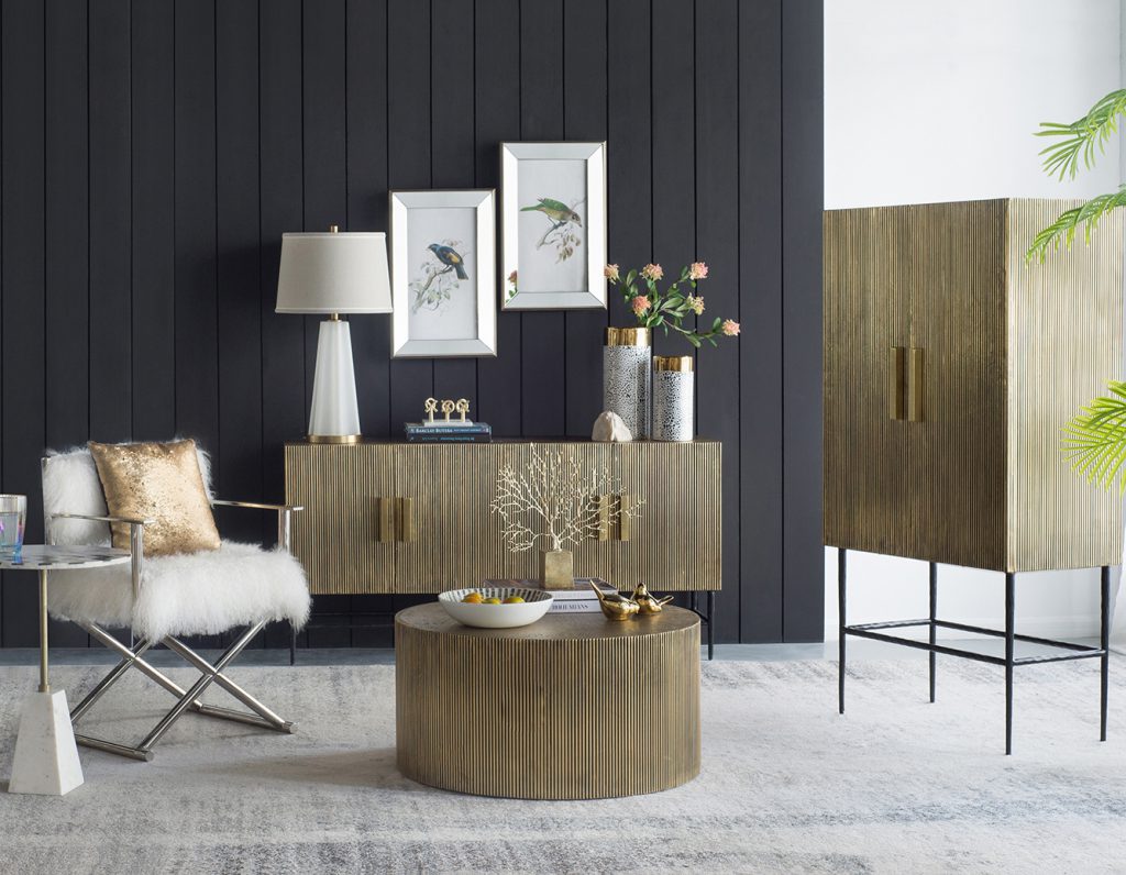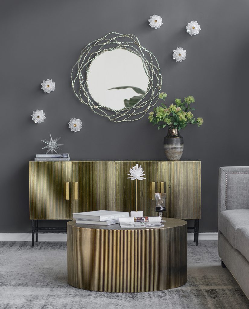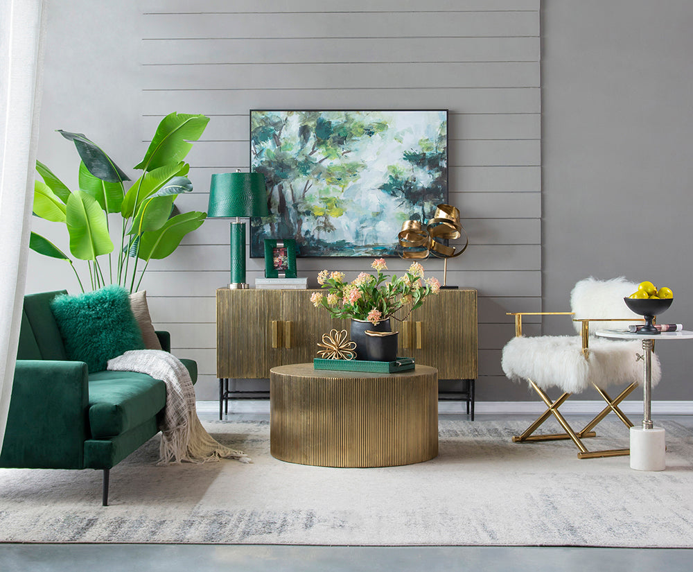 A functional piece thats all dressed up, this scalloped brass coffee table quickly becomes the focal point of a room. Mixed materials and intricate detailing create a beautiful visual, while the circular body provides plenty of usable surface. This is a strong, sophisticated coffee table for contemporary living rooms in search of a vintage touch.
